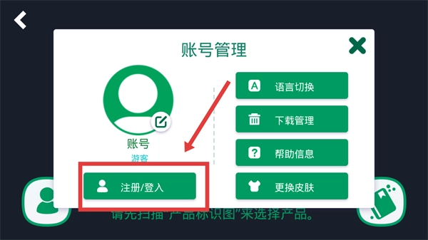 2、进入【账号管理】界面后,点击【注册/登录】按钮,选择登录或注册账号的操作入口。