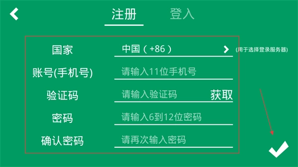 4、切换到【注册】页面,依次填写国家、手机号、验证码、密码等信息,随后点击确认按钮,即可完成账号注册。