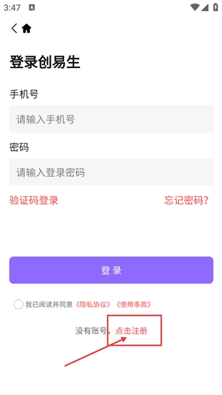 3、在【登录创易生】页面,点击【点击注册】选项,即可进入账号注册表单页面,准备开展注册操作。