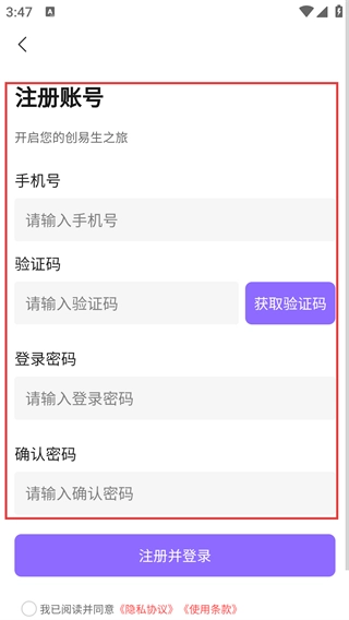 4、在账号注册页面,按顺序填写【号】【验证码】【登录密码】【确认密码】,填写完毕后即可提交注册并完成登录。