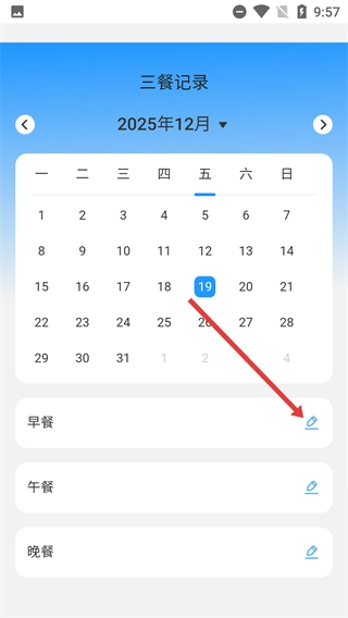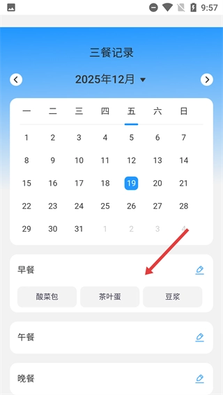 2、在【2025年12月】的日历页面中,选定具体日期后,点击该日期下对应餐食(例如早餐)右侧的编辑按钮,即可进入记录页面。