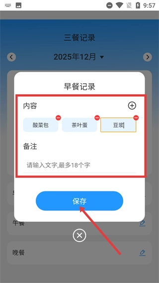 3、在【早餐记录】弹窗里,添加餐食内容(例如酸菜包-茶叶蛋-豆浆),可以补充备注后点击【保存】按钮完成记录。