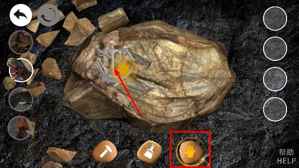 4、当化石骨骼显露出来后,点击底部的【手掌】工具,就能对已露出的骨骼部分进行拾取或整理,从而推动考古挖掘的进度。