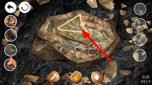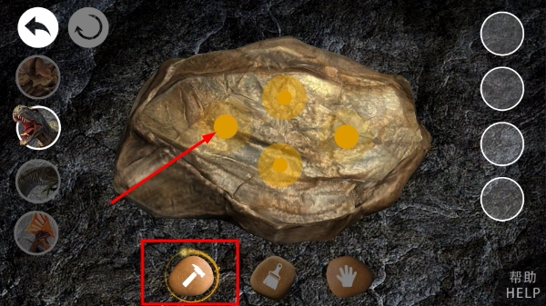 2、进入挖掘界面后,点击底部的【锤子】工具,接着点击化石上带有黄色标记的区域,就能对化石执行敲击挖掘的操作。