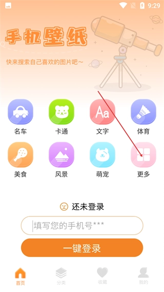 1、进入【壁纸】页面后,你可以选择【名车】【卡通】等分类,也能点击【更多】查看全部分类,不过使用这些功能前需要先完成登录。
