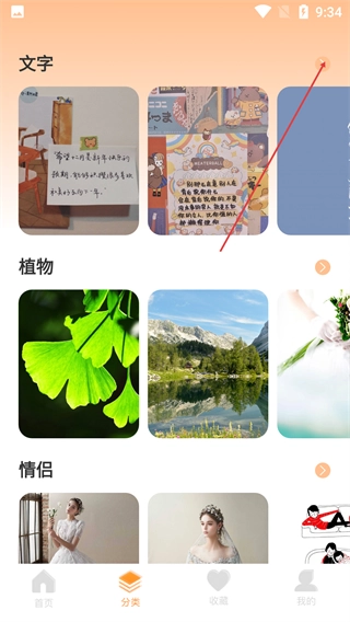 2、在分类页面中,选择【文字】分类即可查看对应的壁纸内容,点击分类右侧的箭头能够加载更多同类型的壁纸资源。