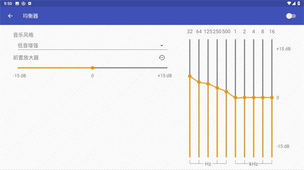 2、点击左上角的“设定”,再点击“平衡器”,即可调节各类音乐风格以及前置放大器等功能。