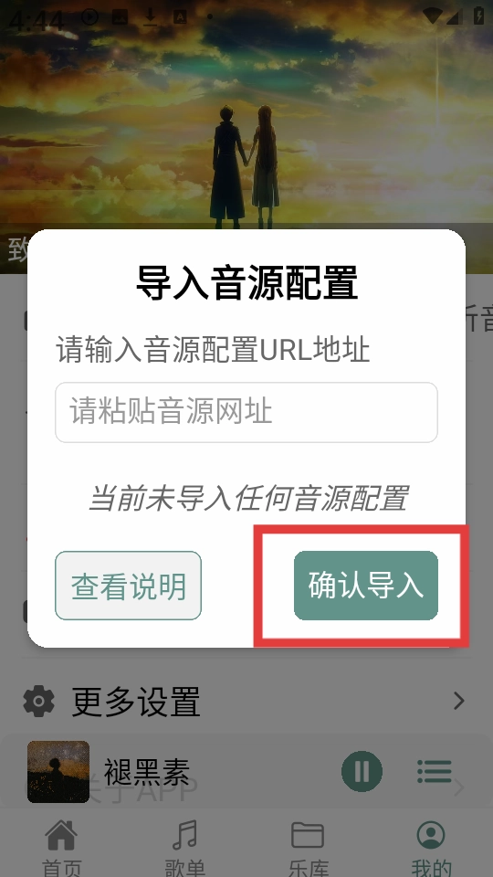 4、把自定义音源的链接复制粘贴到输入框里,检查确认没有问题后,点击“确认导入”按钮,这样就能顺利加载第三方音乐源了。