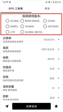 2、如图所示,当工具箱主界面上方的版本栏消失时,意味着版本已选择完毕。接下来只需设置好分辨率、画质、帧数等选项,再点击下方的【应用设定】按钮,就能完成设置的保存。