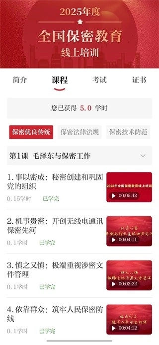 进入系统后,点击“课程”板块即可开启学习之旅。课程涵盖保密优良传统、保密法律法规、保密技术防范以及保密警示案例四个部分,主要采用视频与音频的呈现形式。在学习界面中,您能够随时查看已累计的学时情况。