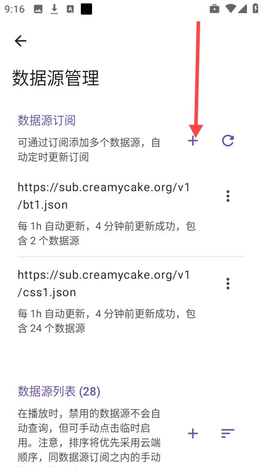 4、进入数据源页面后,点击底部箭头指向的“+”按钮来添加新的来源。