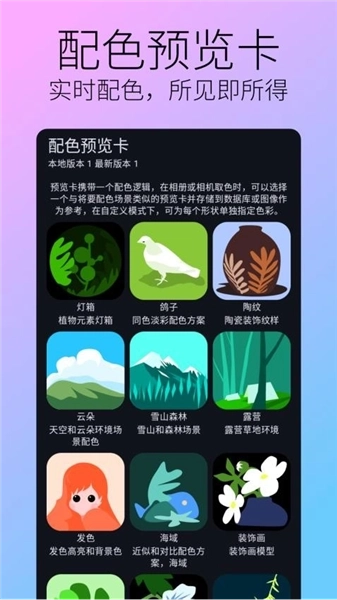 囱彩色彩能够从图像或相机中提取颜色,让你查看专业的色彩信息,还会自动为你进行配色,并且支持多种配色方案以及不同的使用场景。