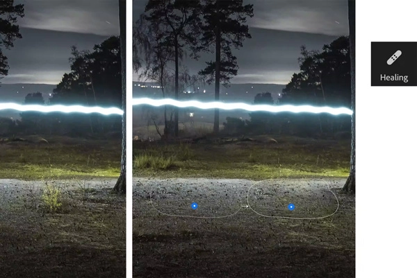 用修复画笔轻点或涂抹画面里的杂点、小物件或是人为痕迹,系统会自动采集周围的像素来进行无缝填充,让场景维持纯净自然的状态。