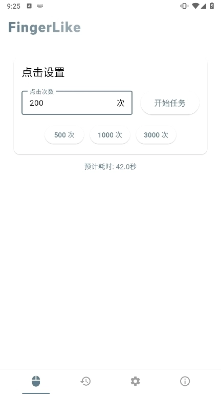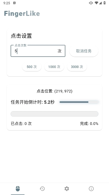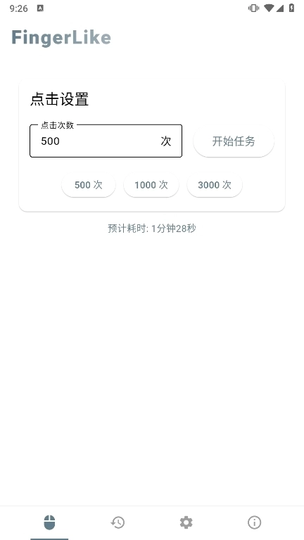 仿生模式:FingerLike具备仿生点击功能,能够模拟人工点击的行为特点,点击位置会带有随机偏移量,从而让操作过程更贴近自然状态,可有效降低因连续固定位置点击而引发的账号封禁风险(例如点赞操作时的防封需求)。在该模式下,完成500次点击大约需要70秒,完成3000次点击则约需790秒。