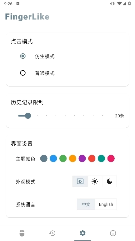 个性化设置:支持中英文切换、自定义主题、暗黑模式等界面定制功能,同时提供历史记录保存和点击测试工具,提升用户体验。
