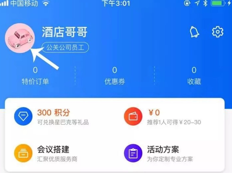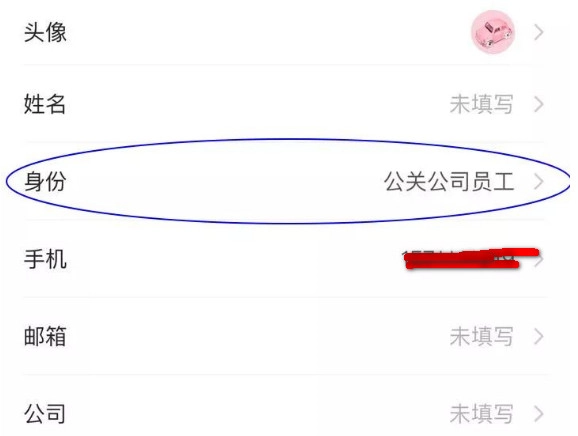 2.点击头像区域进入个人信息页面,接着点击“身份”选项,选择您的身份(建议选择会务公司或公关公司相关职位)