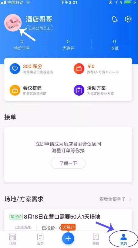 1.更新酒店哥哥,在的 中,点击右下角“我的”