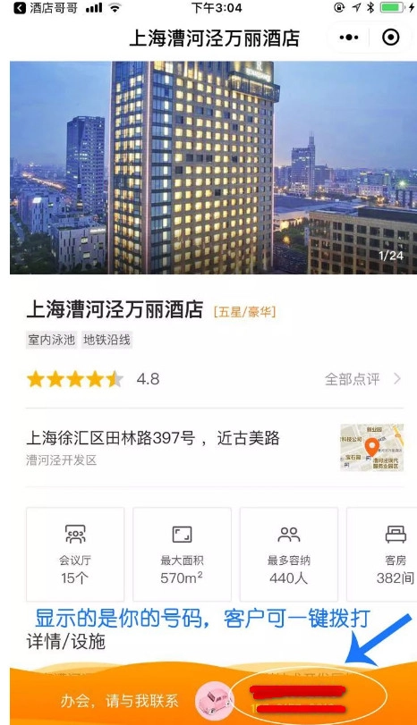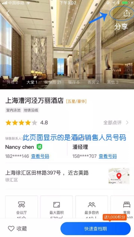 3.回到场地首页,挑选需要发送给客户的场地,点击页面右上角的分享图标。当你将此页面分享给客户后,页面上的联系方式会显示为你自己的,客户可以一键拨打,直接沟通更加便捷。