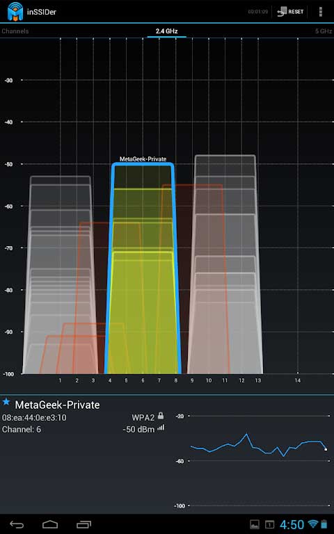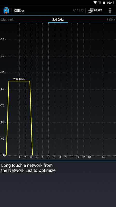 使用inSSIDer能够帮您轻松为WiFi网络挑选合适的频道。它会扫描无线环境,当您选定自己的WiFi网络后,inSSIDer就会推荐最优的WiFi频道。此外,它还能快速便捷地进行常规抽样检测,从而保证信道选择的最佳状态,最大限度减少甚至消除相邻网络带来的干扰。