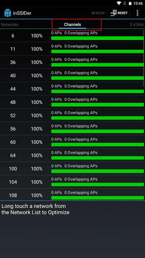 3、若想查看整体的信号强度,可切换至Channels界面。其中绿色代表信号最佳,黄色次之,棕色再次之,红色则为最差。通过对比能发现,数字越小,信号质量越优。