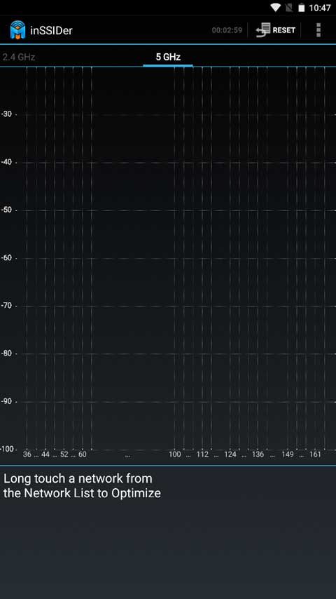 查看5GHz频段的信道使用情况,这是inSSIDer为广大用户提前准备的前沿功能,其显示效果和2.4GHz频段一致。相信在双频段无线网络普及之时,inSSIDer也会为你提供合适的选择。