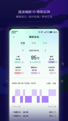 2、睡眠报告:系统会依据用户的睡眠监测数据生成睡眠报告,用户可通过查看报告详情来掌握自身的睡眠状况。