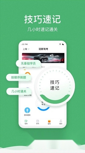 1、首先打开冠群驾考,点击首页的技巧速记选项;