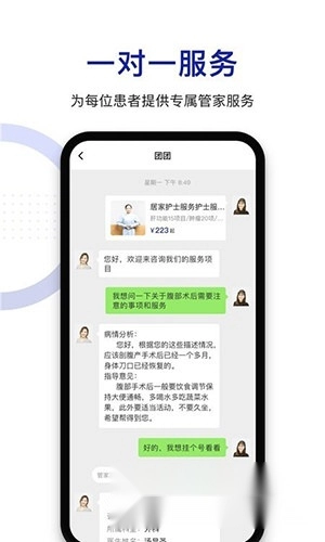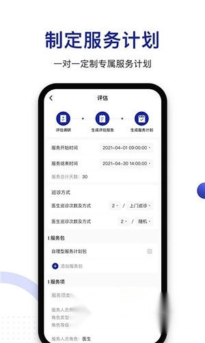 1、这是一个专业的移动医护健康服务平台,可供医生、用户专属健康管家、专业护理人员等不同服务角色使用。