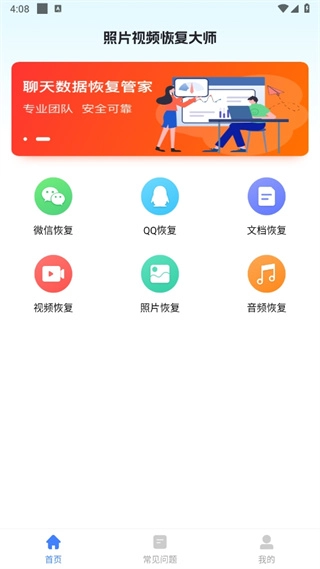 1、启动软件后,可开展微信恢复、视频恢复、QQ恢复、照片恢复、文档恢复以及音频恢复等操作。