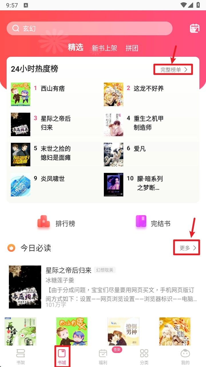 3.点击返回底部导航栏的「书城」,就能浏览热门榜单与上架小说,点击右上角可查看更多相关内容。