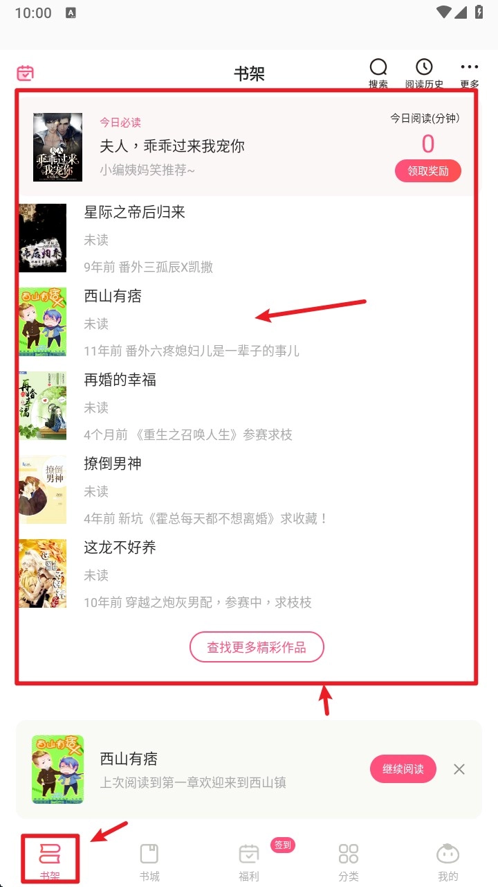 1.打开App后,点击底部导航栏里的「书架」,就能看到已收藏或者正在阅读的小说列表了。