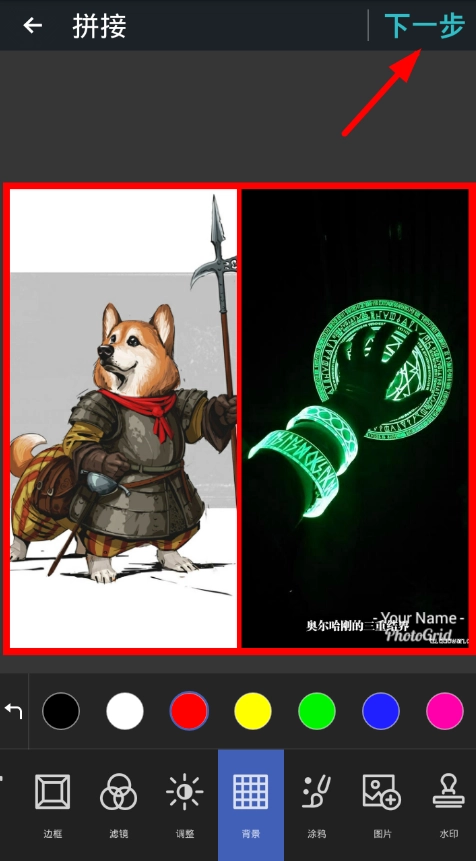 2、接下来在拼接图片的编辑页面下方,找到列表里的“背景”功能并点击,就能更换和设置不同的图片背景了。