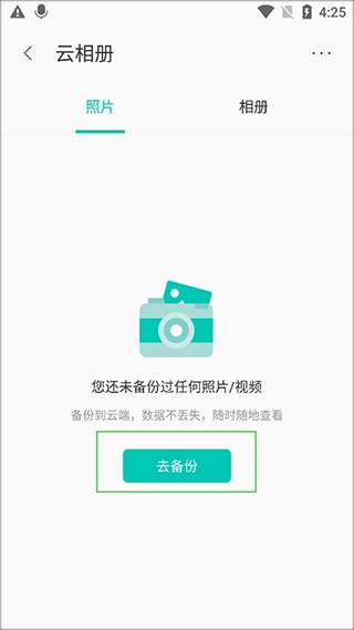2、进入云相册界面后,由于我们还未进行备份操作,所以现在点击屏幕上的【去备份】按钮。