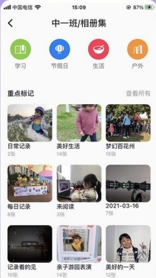 3、在中一班/相册集中,能够了解学习、节假日、生活和户外等方面的内容,并且可以对相关内容进行重点标记。
