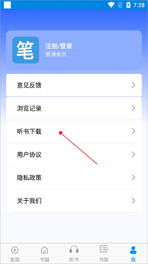3、返回【我的】页面,点击【听书】选项。
