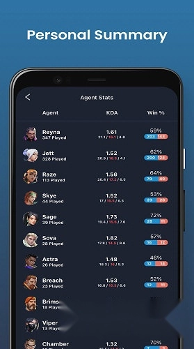 对您过往的比赛进行高效总结,让您能快速了解当前的表现情况。您可以查看各张地图的统计数据、每位特工的排名详情,以及对武器的掌握程度,比如杀人率、死亡率、支持率(KDA)、获胜率或平均命中率等信息。
