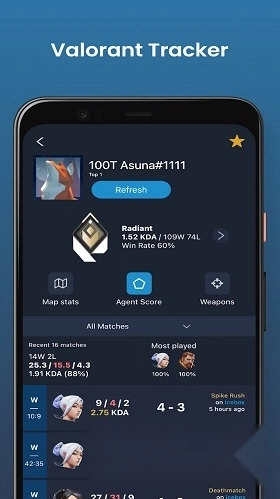 通过它,您可以在全球范围内便捷查看自己的Valorant数据与统计信息。目前该软件支持查询任意地图或排行榜中每个Valorant特工的全球洞察数据,例如个人的击杀死亡助攻比(KDA)、胜率、平均命中率等,帮助您了解近期竞技水平是否有所提升。