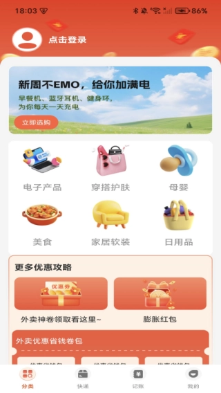 1、分类购物板块里,除了丰富的商品分类外,还为用户准备了外卖神券、膨胀红包等优惠攻略,助力用户享受更实惠的购物体验。