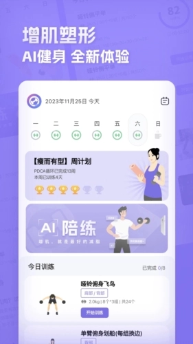 硬核健身训练体验:肌肉计划为致力于塑造身体线条与提升力量的用户,提供专业的居家健身陪练服务与训练指导。