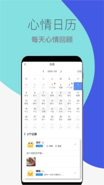 用户还能查看软件自带的日历内容,借此清晰了解自己每天的心情状态。