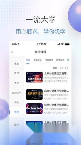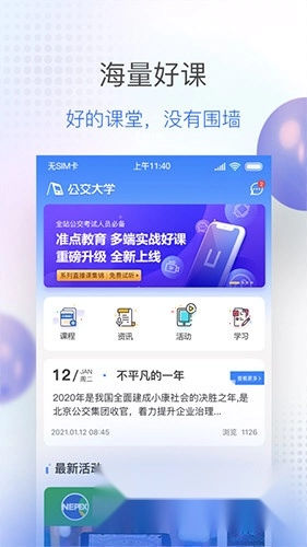 1、公交大学设有课程板块,用户能在这里找到各类课程,开展在线学习;