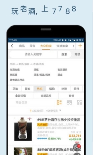7788老酒是一个专业的好酒销售平台,平台上汇聚了丰富多样的酒类产品,涵盖老酒、藏酒、白酒、红酒、黄酒、洋酒、养生酒等多个品类。用户可以根据自身需求和喜好挑选心仪的酒品,满足不同场景下的购酒需求,带来优质的消费体验。 同时,7788老酒平台还为老酒收藏爱好者搭建了线上交流与交易的空间。在这里,众多收藏者分享各自的珍藏,不少老酒企业也入驻平台售卖各类名酒,用户可自由选购。平台定期举办拍卖会,用户缴纳保证金后即可参与竞拍,所有上拍的老酒均经过专业鉴定,确保无假货,让大家可以安心参与。喜爱酒类收藏的朋友,不妨来体验一下!