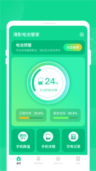 清影电池管家是一款面向智能设备用户打造的电池管理优化工具。借助这款应用,用户能实时掌握电池状态,知晓剩余电量的可用时长,以便及时充电,保障电池安全。软件还配备了降温、网络测速、生活记账等实用功能,让使用过程更顺畅高效,全方位提升用户的管理体验。它为用户提供了一站式的管理方案,支持实时电池监控,用户可随时查看电量、健康度等关键指标,确保电池处于最佳工作状态。当电池电量偏低或出现异常时,应用会及时发出提醒,让用户能采取相应措施。用户只需轻点操作,就能启动智能降温程序,降低设备温度,提升运行效率,这一功能尤其适合长时间使用设备的用户,比如玩游戏或观看视频时。