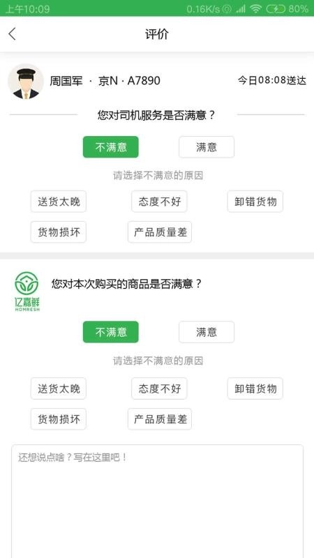 5、点击评价按钮,用户可对司机的服务质量以及所购买的商品分别进行评价。