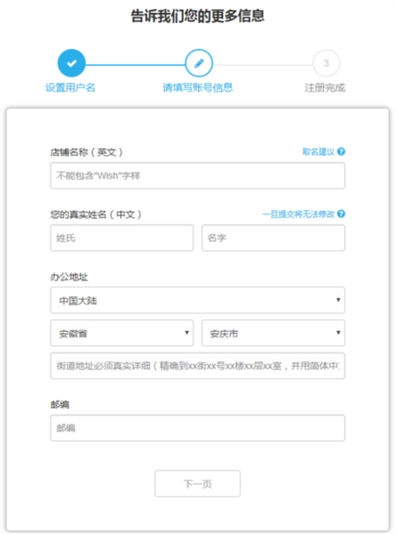 1、请填写您的店铺名称,请注意店铺名称中不能包含“Wish”字样。店铺名称一旦设置完成,后续将无法进行修改。