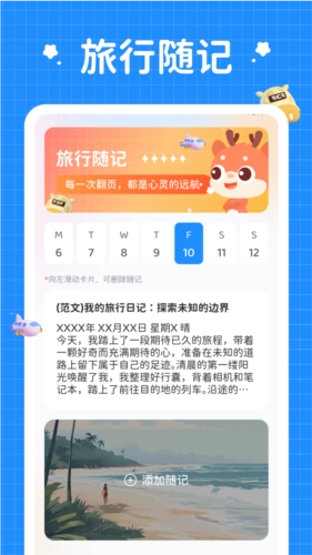 实时记录旅行随记:软件首次上线就具备随时记录旅行感悟和日历查看功能,助你便捷记录旅途中的点滴见闻。