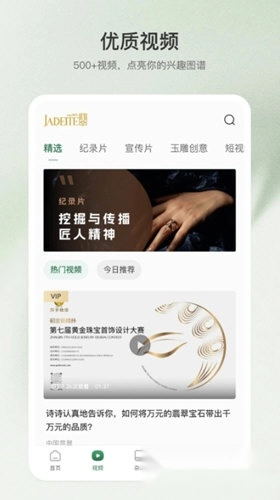 ②视频内容丰富多元,借助云技术保障视频播放的流畅度与清晰度。涵盖沙龙、访谈录、时讯、宣传片、翡翠知识、南红之谜、萌课堂、百家讲坛等多种形式,从入门级知识普及,到顶尖设计师、玉雕师的独家访谈,再到时讯动态记录,全方位带您领略翡翠珠宝的独特魅力,学习专业知识,分享品鉴翡翠珠宝的美好体验。