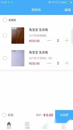 安家居具备一键管理购物车商品的功能,可直接全选所有商品,整合商品信息后一键生成采购订单。