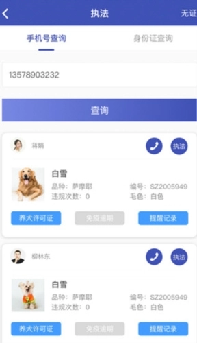 执法记录查询:执法人员执法记录查询、犬只违法记录查询等。