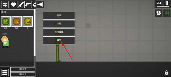 3、接着抬起胳膊,双击西瓜角色的胳膊,此时会弹出删除、冻结、静置碰撞、启用等选项,选择冻结,胳膊便会停止动作。